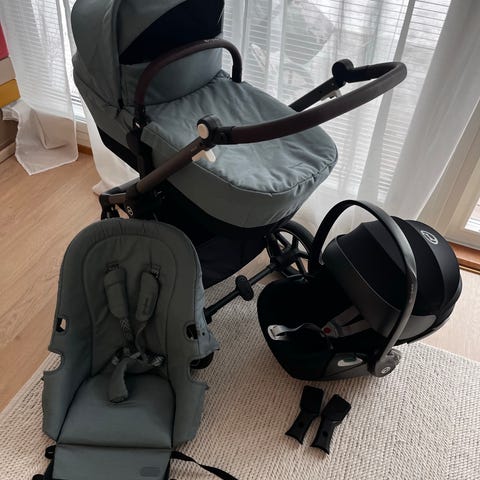 Cybex yhdistelmävaunut, joissa on erillinen vaunukoppa vauvalle ja istuinosa isommalle lapselle. Vaunukoppa on musta ja istuinosa harmaa. Pieniä käytönjälkiä jotka näkyy kuvissa. Istuinosan saa säädettyä useaan asentoon. Talvirenkaat kuuluu hintaan, ne saa vaihdettua pienten etupyörien tilalle. Hyvin pääsee silti liikkumaan erilaisissa maastoissa pienten pyörienkin kanssa.
