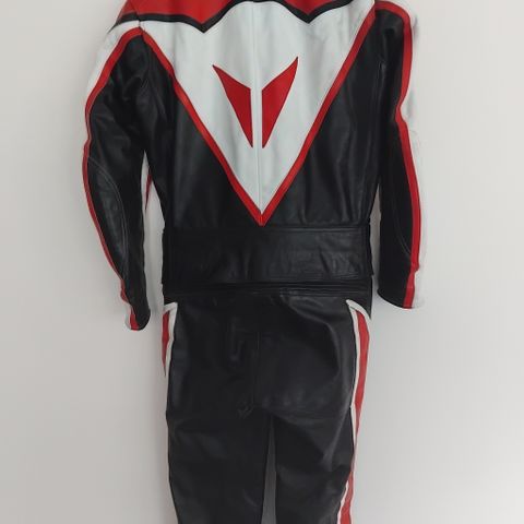 Moottoripyörä nahkapuku koko 42 ja ajovarusteet (hanskat L 10, saappaat koko 44). Kokonaisuuteen kuuluu kaksiosainen nahkainen ajopuku, jossa on punaisia, mustia ja vaaleita paneeleja sekä vahvistetut alueet hartioissa, kyynärpäissä, polvissa ja lantiossa. Lisäksi mukana on erillinen musta-punainen sade- tai suojahaalari puvun päälle. Varusteisiin sisältyvät myös pitkät mustat ajohanskat kovilla rystys- ja sormisuojilla sekä mustat-punaiset sporttiset ajosaappaat, joissa on nilkka- ja säärituet sekä säätösolki. Sopii moottoripyöräilyyn ja rata-ajoon suojaavaksi ajovarustekokonaisuudeksi.