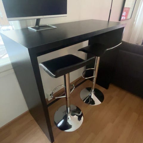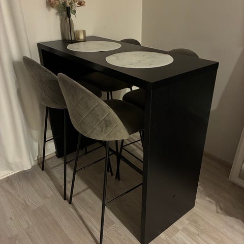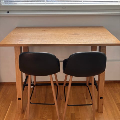 Tässä käytetty, tyylikäs kokonaisuus, joka sisältää korkean pöydän, kaksi korkeaa tuolia sekä ruskean nukkamaton.