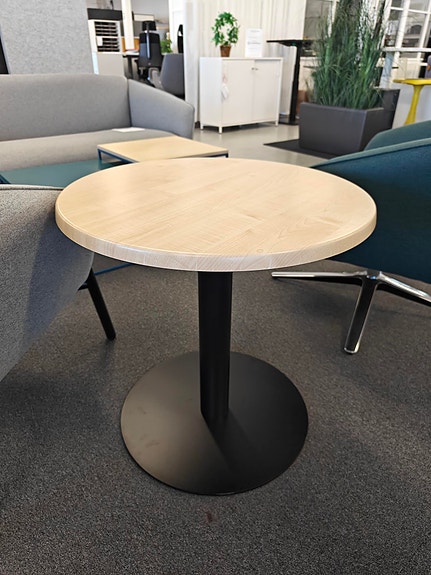 Pöydässä on musta Lena 110 laippajalka. Pöydän korkeus on noin 112 cm.