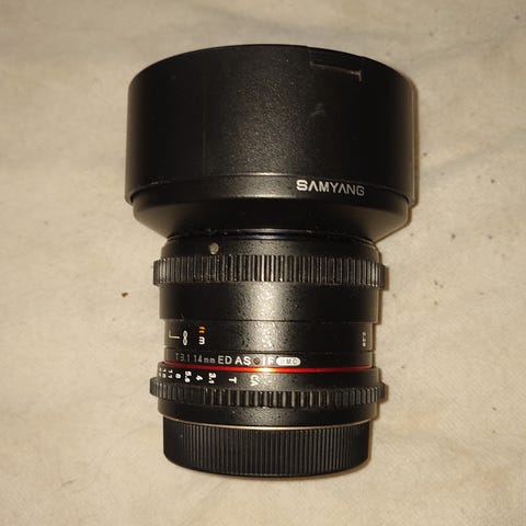 Uudenveroinen ja vähän käytetty Samyang F2.8/14 mm ED AS IF UMC laajakuvaobjektiivi.