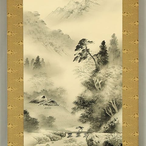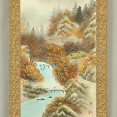 Muinaisten mäntyjen kehystämänä ja kohoavan vuoristomistan sumun keskellä tämä Chikuho’n signeerattu ja sinetöity kakejiku (掛軸) | hanging scroll tarjoaa tyynen ja hiljaisen majesteetin näkymän Fuji-vuorelle. Lumenpeitteisen huipun asema on rauhallisen auktoriteetin hallussa kerrostuneiden kukkuloiden yläpuolella, kun vanhojen mäntyjen kiertävät oksat ankkuroivat kohtauksen iän ja vastustuskyvyn tunteeseen. Hienovaraiset monochrome-musteet muovaavat syvyyden ja ilmapiirin, heijastaen japanilaisen maisemamaalauksen klassista kurinalaisuutta. Mukana alkuperäisen tomobakon (puinen säilytysboksi) kanssa, riipuslasi loistaa hienostunutta olemusta, joka sopii sekä perinteisiin että moderneihin tiloihin. Seinälle asetettuna se luo rauhallisen, ajattoman tunnelman— vuoren, sumun ja arvokkaiden mäntyjen vuoropuhelu kutsuu hetkelliseen hiljaisuuteen.竹峰 Chikuho Japanese art kakejiku kakemono hanging scroll / Mount Fuji and Old Pine Trees with Original Box (Tomobako)with signature and seal 'Chikuho' 竹峰Kokonaismitat: 23.3" W x 75" H / 59.3cm x 190.6cmSisämitat: 15.9" W x 41.2" H / 40.6cm x 104.8cmMateriaalit: SilkTekniikka: KäsinmaalattuRullien päät: PuuPaino: 880 g mukaan lukien alkuperäinen boksi (Tomobako)KuntoAntiikkiesineillä on alun perin hieman rypistymää, tahroja, vaurioita ja muuta. Toivon, että viittaat luettelo-kuviin, mutta ymmärräthän, että kaikkia kunto-olosuhteita on vaikea näyttää valokuvin. Erikoismerkinnät: TAHRA vähän, VÄRTI-JA, TAHRA kiinnityslevyn takana.Toimitus"ILMAINEN TOIMITUS" kaikille maailman alueille International ePacket Lightin, EMS:n tai DHL:n kautta.