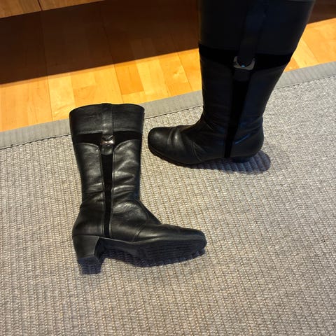 Siistit kotimaiset nahkanilkkurit, korko 4,5 cm, varsi 18 cm. Pidetty suojapohjallisen kanssa.