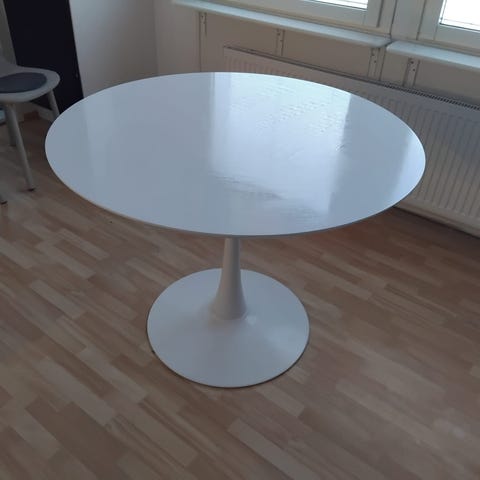 Myydään tukeva pyöreä pöytä, halkaisija 118cm. Pöydän pinnassa maalitahroja ja hankausjälkiä, muuten kunto hyvä.
