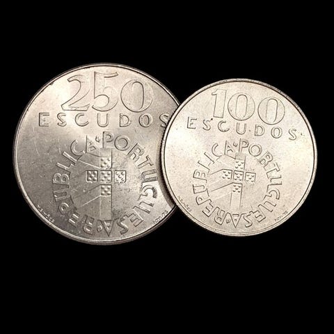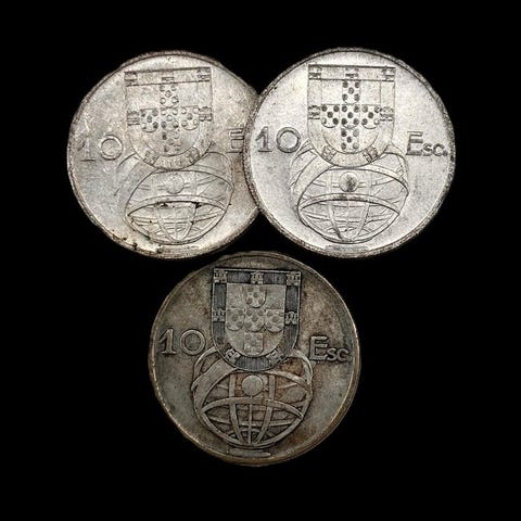 Portugal.4 Hopeakolikoita: 1x 10 Escudos + 3 x 20 Escudos (42,46 g) - 1954-1966 10 Escudos1954-1955Moedas › Moedas circulantes comuns: System 1927-1968Hopeaa 680‰ • 12,5 g • ⌀ 30 mmKM# 586, Gomes# R 44, N# 3594 20 Escudos (Salazarin silta)1966Moedas › Moedas circulantes comemorativas: System 1927-1968 – Salazarin siltaHopeaa 650‰ • 10,12 g • ⌀ 30 mmKM# 592, Gomes# R51, N# 6580---------------Shipping info:Toimituksissamme yhdistettyä lähetystä ei ole mahdollistaAina vakuutettunaNouto myymälästä ei ole käytettävissä.