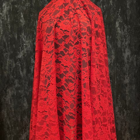 Musta pitsikangas 3,25 m leveys 140 cm boordi molemmissa reunoissa. Tekokuitua, mutta näyttää puuvillalta.