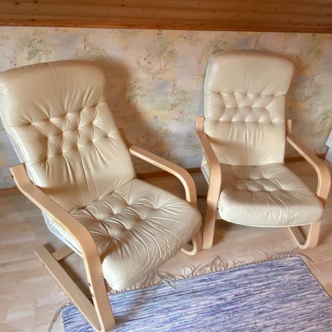 Kolme mustaa nahkaista nojatuolia, kaksi tuoleista valmiiksi koottuja. Vanhat tuolit, mutta siistit ja hyväkuntoiset. 10 €/kpl. Vain nouto.
