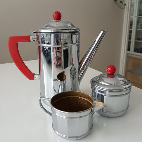 Tämä on Art Deco HAMERSLAG -hopeoitua makeis- ja teepurkkia Gero-merkkiseltä. Seuraava tieto on oleellinen:Maahantuoja: AlankomaatValmistaja: Gero (1910-1975)Valmistuskausi: 1930-1940Materiaali: Hopeoitua 90Mallinumero: 167Mitat: Halkaisija x korkeus = 8 cm x 12,5 cmPaino: 283 gKunto: Hyvä käytetty kuntoTämä Art Deco -hopeoitua makeis- ja teepurkkia lähetetään hyvin pakattuna ja rekisteröidyllä/vakuutetulla toimituksella, mutta sen voi myös noutaa ajanvarauksella Edel Erfgoedista Klarenbeekissä Alankomaissa (lähellä Apeldoornia).