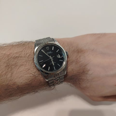 - // HUOMAUTUS HUIDINTEKJÄLLE // - Kun kello on varustettu jälkiasennusosilla tai toisen viiteen liittyviä alkuperäisosia, kello katsotaan räätälöidyksi kelloksi. Tämä tarkoittaa, että kellossa voi olla komponentteja, jotka poikkeavat alkuperäisistä tehtaan spekseistä. Räätälöinti voi vaihdella suuresti, joten korostamme seuraavat mahdollisuudet täysin läpinäkyvyyden vuoksi:- Jälkiasennusosat - Kellossa voi olla kolmannen osapuolen komponentteja (kuten bezelit, kellotaulut, asiarat, lasit tai jalometalliasetukset), joita ei ole valmistajan toimittama. Nämä osat lisätään usein esteettisistä syistä, mutta niitä ei pidetä valmistajan alkuperäisinä.- Alkuperäisosat muista malleista - Jotkut komponentit (esim. kellotaulut tai rannekkeet) on voitu hankkia samalta merkiltä olevista muista oikeista kelloista. Vaikka nämä osat ovat aitoja, niitä ei alun perin ollut valittu tähän tiettyyn malliin tai viitteeseen, mikä voi vaikuttaa keräilyarvoon tai valmistajan huolto- kelpoisuuteen.- Ei-alkuperäiset osat - Joissain tapauksissa räätälöidyissä kelloissa voi olla osia, jotka eivät ole alkuperäisiä eikä valmistajan valmistamia. Nämä osat voivat vaikuttaa kellon arvoon.räätälöidyt kellot eivät välttämättä ole oikeutettuja viralliseen huoltoon tai takuuseen merkiltä. Kaikkien tarjousten on oltava tietoisia yllä kuvatun räätälöintitilan olemassaolosta.=====================================================================================================—// KUVAUS //—Malli: Tudor Prince Date 74033 Two-Tone Gold Dial w/ Roman Numeral Print Men's Automatic Sports watchCirca: Post 2000Materiaali: Ruostumaton teräs kellon taulu: KultaKotelon koko: 34 mm (lukon mukaan pois lukien kruunu)Sovitus: Kädelle enintään 19,0 cmLiike: ETA 2824-2 Automaattinen liikeVaravoima: ~38 tuntiaToiminnot: Aika, päivän ja päivämäärän näyttö, syleilevät osoittimet, automaatti- ja manuaalinen viritys, ruuvaantuva kruunu** HUOM: Vesitiiviyden testausta ei ole tehty kellolle. Ei suositella uintiin tai sukellukseen. Ole erityisen varovainen veden läheisyydessä käytettäessä kelloa **—// TOIMITUS SISÄLLÖT //—Alkuperäinen laatikko: Ei *(jäkikäyttöinen laatikko)Alkuperäiset todistukset: Ei—// TILANNE //—Kotelon kuluminen (ALKUPERÄINEN): Pienet käytön jäljet *(Pienet kulumisjäljet, hiusnaarmut ja pienet kolhut normaalista käytöstä)Kotelon takana kuluminen (ALKUPERÄINEN): Pienet *(kirkkaiden naarmujen kera. "ROLEX" -kotelon takana)Kristallin kuluminen (MÄÄRÄTÖNTÄ): Ei/merkityksetön *(Sapphire-kristalli. Lähes virheetön, pinnalla minimaaliset käytön merkit)Kellotaulun kuluminen (ALKUPERÄINEN): Merkityksetön / pieni ("T SWISS MADE T" tulostettu 6:n kohdalta. Luminenssit ovat tallella. Luminenssit näyttävät turpoamisen ja ovat haalistuneen keltaisia. Tulostus hyvässä kunnossa. Pieniä virheitä taulussa hyvin pienistä hapettumisesta johtuvia "pisteitä". Suuri patina)Kellonosien kuluminen (ALKUPERÄINEN): Merkityksetön / Pieni (Pieniä hapettumisen merkkejä metallissa)Bezelin kuluminen (JÄLKISÄÄNTÖT) : Merkityksetön *(jälkiasennus kultausmetallinen bezel)Kruunun kuluminen (ALKUPERÄINEN) : Pieni*(Alkup. kruunu kilven logolla. Ruuvisauma toimii OK lujuuslukituksen kanssa 1,5 kierroksen verran.)Nahkarannekkeiden kuluminen (JÄLKISÄÄNTÖT) : Ei *(Jälkiasennusnahkaranneke, jälkiasennusmetallinen solki)TILANNE ARVIOINTI STANDARDI:Ei mikään (Paras) —> Merkityksetön —> Pieni —> Keskikokoinen —>
