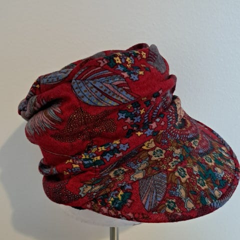 Itse hattu punainen, mustat koristeet (harso, sulka, ruusuke, pitsi lierin ympärillä.