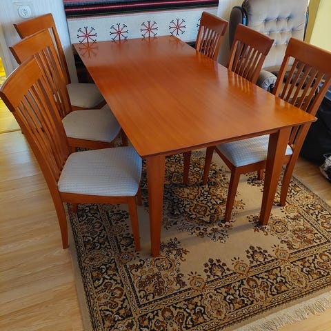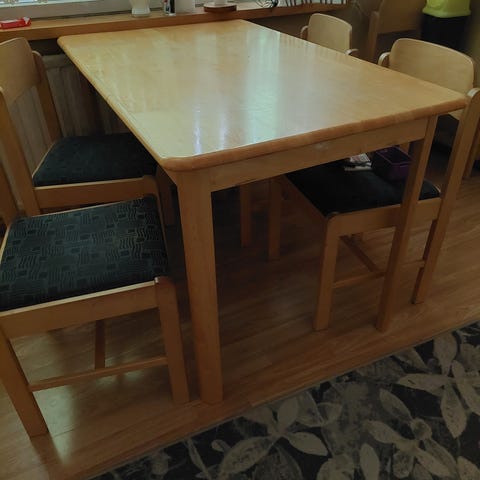 Askon ruokapöytä ja tuolit. Käytön jälkiä löytyy, joten niin löytyy myös tinkivaraa.
