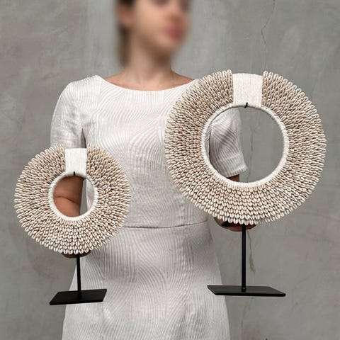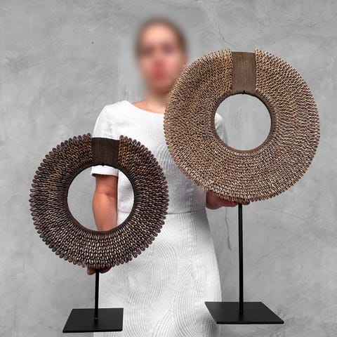 Set of tribal necklaces made of nassa shells. TOLAÏ tribe, New Britain, Papua New Guinea. The necklaces contain hundreds of little Nassa shells. The remarkable thing is that almost all of them are in the same size, therefore they have a very sleek primitive design.Approximate Dimensions including standNecklace 1: height 41 cm, width 30 cmNecklace 2: height 28 cm, width 21 cmNOTE:- One or more images provide a styled representation of a similar item. For exact details of the item for sale, please refer to the other images. No items in the styled photo are included in the sale.- THE WEIGHT MENTIONED IS INCLUDING STAND AND PACKING MATERIAL.THE SHIPMENT- The item will be sent with a Track & Trace code via DHL Parcel, DPD or postNl. The tracking will be updated in your Catawiki lot once your parcel has been dropped off. - Please check regularly to avoid your parcel being returned to us, in which case the buyer will be responsible for the shipping costs of the 2nd shipment.- For tracking to Spain and Portugal please use this link and add the tracking number from your Catawiki lothttps://clientesparcel.dhl.es/LiveTracking/HomeWE DO NOT COMBINE SHIPPING!!!If you have any questions about your parcel please contact us using the Catawiki message service. We will try to reply within 3 working days.