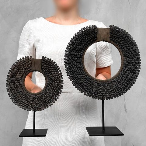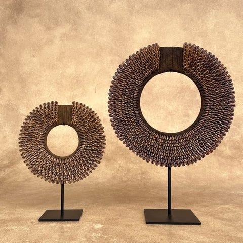 Koriste-esine (2) - Pair of caramel coloured tolai necklaces on custom stands -