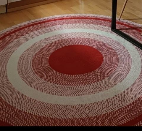 Pyöreä matto mustavalkoinen. Matossa on useita keskeltä ulospäin eteneviä renkaita eri harmaan ja mustan sävyissä. Pinta on tiiviisti kudottu. 100% puuvillaa. Yleisilmeeltään siisti ja lähes uutta vastaava.