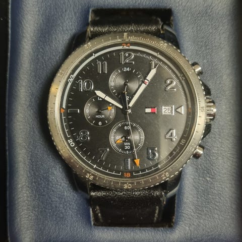 Tommy Hilfiger miesten rannekello mustalla pyöreällä kellotaululla ja metallirannekkeella. Kellossa on suuret arabialaiset numerot sekä tunti-, minuutti- ja sekuntiviisarit. Kuori on tummasävyinen ja takakansi terästä, jossa Tommy Hilfiger -logo. Sopii miehille arki- ja vapaa-ajan käyttöön. Lasissa pieniä naarmuja, laatikko hävinnyt.