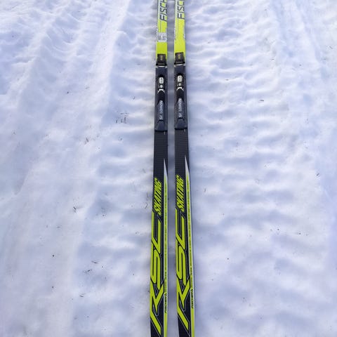 Hyväkuntoiset vanhat luistelusukset siteillä.