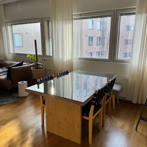 Jysk ruokapöytä, jossa suorakulmainen puinen pöytätaso ja metalliset ristikkojalkat. Pöytälevy on luonnonsävyistä puuta, jossa näkyvä puunsyykuvio. Sopii ruokapöydäksi tai työpöydäksi ruokailu- tai oleskelutilaan. Hyvässä kunnossa, pöytälevy öljytty. Kuljetusta varten jalkaosat voi irrottaa, pöytälevy on yhtenäinen.