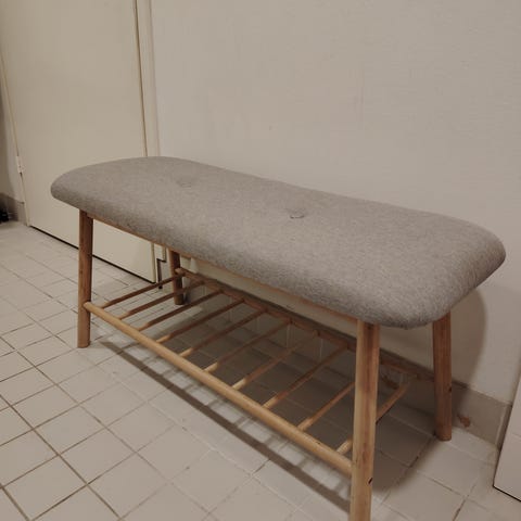 Valmistettu koivusta ja mdf-levystä. Pintakäsitelty petsilakalla. Kannessa pieni naarmu (katso kuva 3).