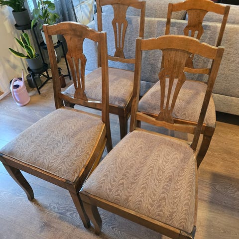Kuvan upeat 30/40-luvun ruokapöydäntuolit 4kpl saapuivat myyntiin. Kunto ikäisekseen jokaisessa hyvä. Rungot tukevia. Verhoilut ehjät ja siistit. Ei hajuja. Istuinkorkeus 47 cm. Myydään settinä.