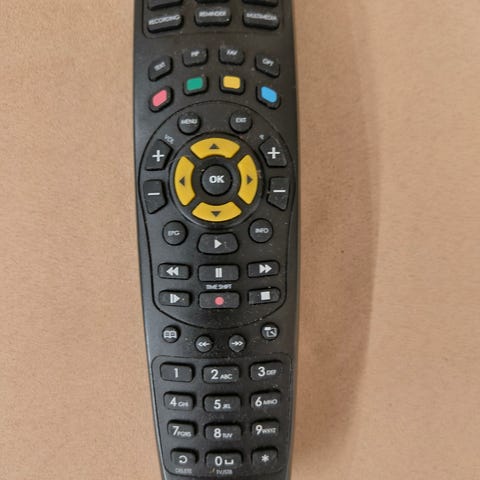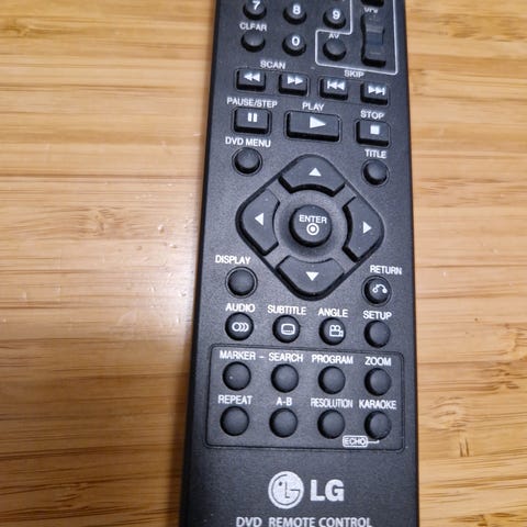 Neljä kaukosäädintä, osa dvd-soittimiin ja digiboxiin sekä yhdistetty dvd/tv kaukosäädin (lg).