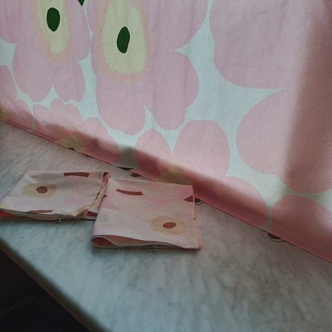 Verhoissa sivut ja yläkäänne ja alakäänne ommeltuina. Pituus 239 Leveys verhoilla 68 cm.