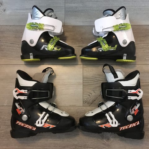 Atomic E15 laskettelumonot. Harmaat kuoret punaisilla soljilla ja yksityiskohdilla. Neljä mikrosäädettävää solkea ja kantahihna.