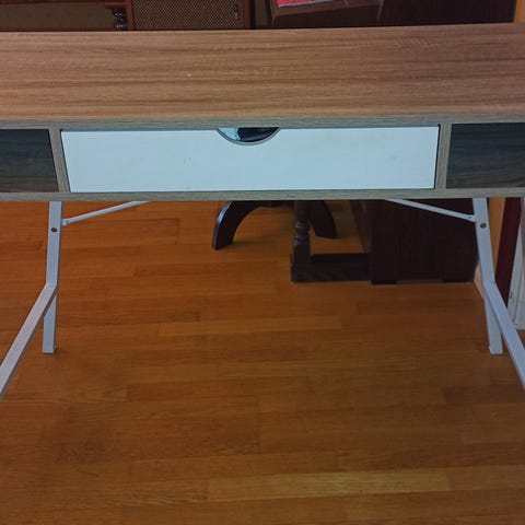 Pöydässä muutama pieni jälki, isoimmasta kuva, kolhu reunassa, saa hyvin peitettyä maalilla tai peitekynällä.