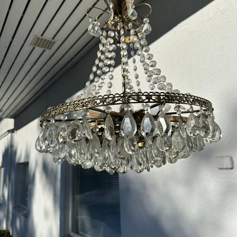 Myydään ihana kattovalaisin, täysin toimiva. Ostettu antiikkivintage -liikkeestä Turusta vuosia sitten. Kultainen. Kaikki kristallit tallella. Valaisee todella kauniisti ja tehokkaasti tilan.