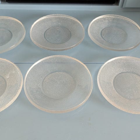 Viidessä kulhossa vielä Nuutajärven tarrat paikalla. Ei iskemiä tai halkeamia. Tarrallisissa minimaalista käyttökulumaa. Vaihtelevaa käyttökulumaa. Osassa vähäistä ja osassa runsaammin.