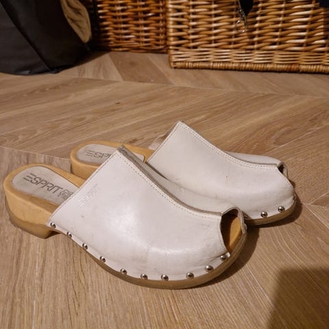 (Myynnissä myös valkoiset samanlaiset, ks. ilmoitukseni) Espritin mustat puiset sandaalimaiset puukengät kokoa 41. Todella mukavat muuten jalassa, mutta omistaja ei meinaa pysyä näillä pystyssä. Jos joku osaa tällaisilla pysyä pystyssä niin nyt olisi tässä tällaiset tosi muodikkaat, mutta ehkä vähän riskaapelit nilkoille, jos ei ole tottunut platformeihin tai omaa vinon jalan. Päällys nahkaa. Parikymmentä vuotta vanhat, mutta ei paljoa käytetyt. Hieman likaa näkyy, mutta voi varmasti putsata. Viimeisessä kuvassa näkyvät myös valkoisena, tein toisen ilmoituksen niille erikseen, jos ostat molemmat saat pakettialennusta :)
