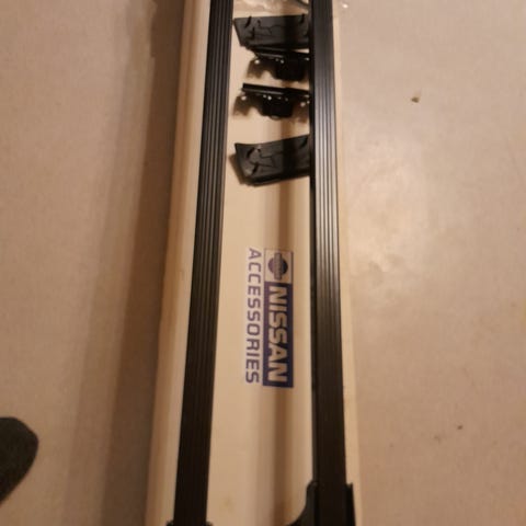 Alumiiniset kattotelineet, joissa muoviset kiinnikeosat. Sopivat auton katolle poikittain asennettaviksi. Soveltuvat esimerkiksi kuljetuslaatikon tai muiden kattovarusteiden kiinnittämiseen. Tarkemmat mitat ja automalli- tai merkkikohtainen yhteensopivuus eivät käy ilmi kuvista.