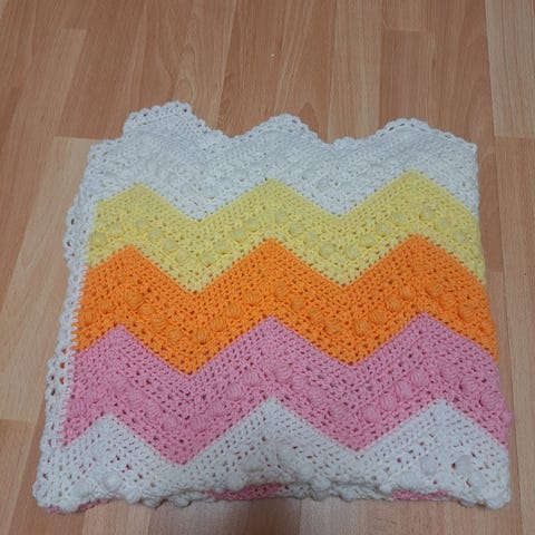 n. 70cm x 90cm itse tehty vauvanpeitto sopii myös vaikka koristeeksi. Novitan onni langasta 70% villaa. Kestää 30° konepesun ei saa laittaa kuivuriin. Painaa vajaa 500g