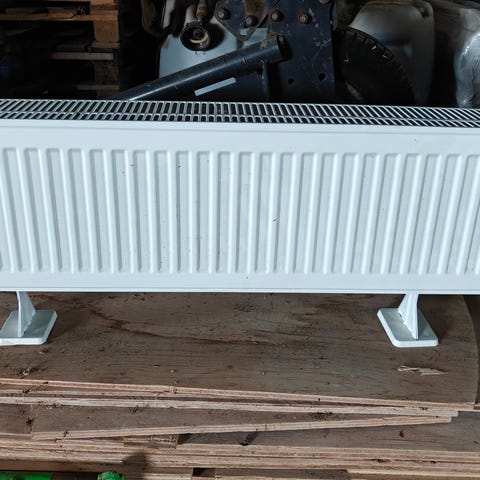 Purmo valkoinen teräspatteri, jossa pystysuuntaiset lamellit ja yläritilä. Patteri on varustettu lattiajaloilla, joten se voidaan asentaa seisomaan lattialle. Soveltuu vesikiertoiseen lämmitysjärjestelmään, liitoskierteet näkyvissä päädyssä.