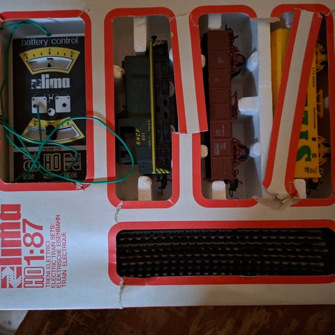 Vanha junarata setti. Pakkaus sisältää veturin, useita vaunuja, kaarevia kiskonpaloja sekä ohjausyksikön. Kaikki osat ovat hyvässä kunnossa. Viimeksi kun kokeiltiin, niin toimi myös.