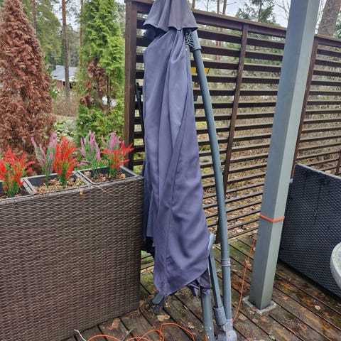 Kuvassa oleva hyväkuntoinen Brafab aurinkovarjo , varjon halkaisija 3 m ja korkeus 250 cm sekä jalustan painot 4 * 25 kg.