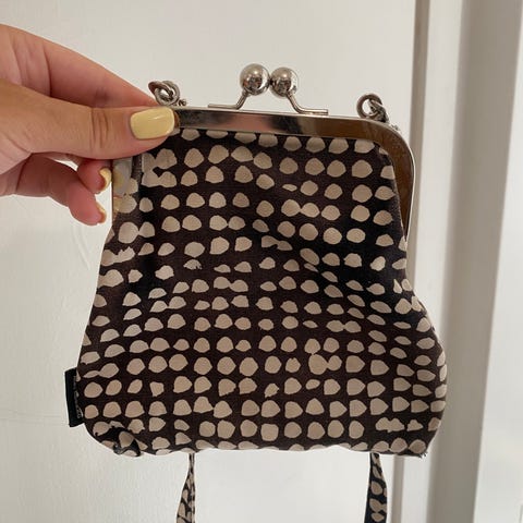 Marimekko Unikko kangaslompakko naisille. Lompakko on valmistettu kankaasta ja siinä on metallinen kehys ja nipsulukko. Kuosina on Marimekon Unikko-kukka tummissa sävyissä vaalealla pohjalla. Sisäosa on yksiosainen ja vuoritettu kankaalla. Sopii esimerkiksi kolikoiden, pienten korttien tai muiden pientavaroiden säilytykseen.