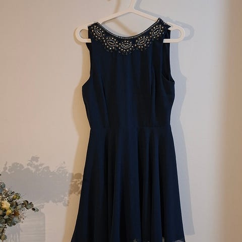 Kirjava sinertävä mekko. Kuvassa näyttää enemmän mustavalkoiselta kuin oikeasti on. Kuvio sini harmaa musta.