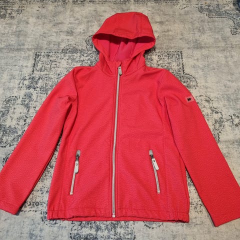 Ihanan pehmeä hengittävä tuulenpitävä välikausitakki pehmeällä vuorella, jossa on irrotettava huppu, elastiset hihansuut ja heijastimet. Vedenpitävä rintatasku. Koko 140 cm