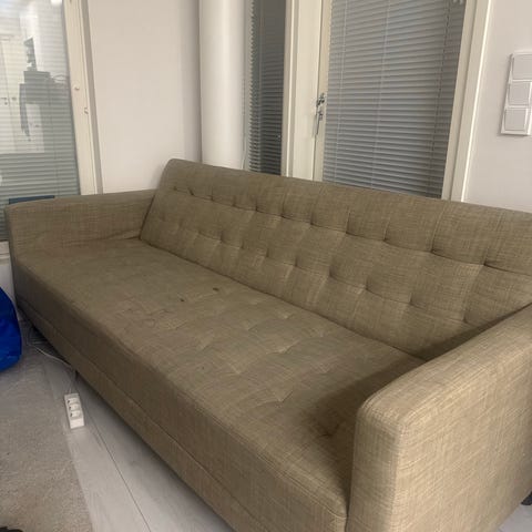 Rauta sohva/ sänky, levitettävä. Patjat halutessaan mukaan. Osittain purettuna, jotta mahtuu ovista siirtämään.