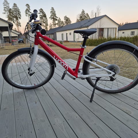 Woom lastenpyörä 20" rengaskoossa. Pyörässä on kevyt runko, käsijarrut sekä lisäosina ostettu lokasuojat jq seisontatuki. Väritys on punainen. Siistissä kunnossa, sisällä säilytetty.