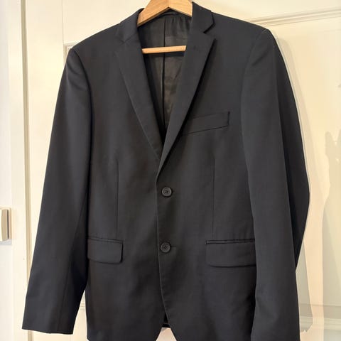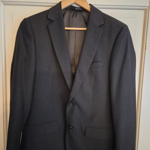 Kaksiosainen setti, jossa takki ja housut. Väri musta. Sopii esimerkiksi juhla- ja työkäyttöön. Vain kerran käytetty. Erinomainen kunto.