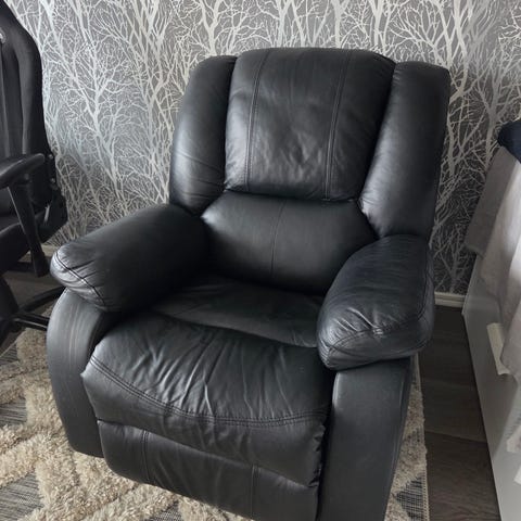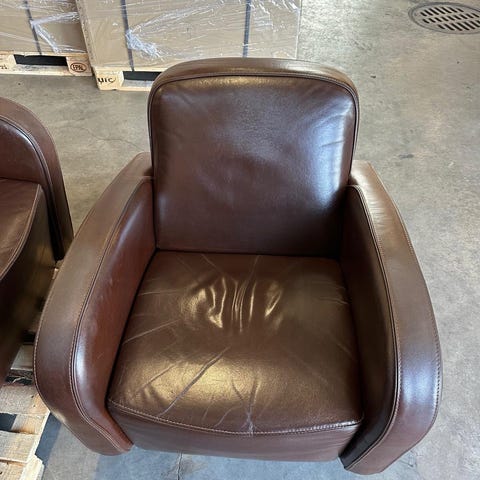 Vaaleat puurunkoiset nahkaiset nojatuolit. Jonkin kerran käytön jälkeä mutta verhoilut ehjät.