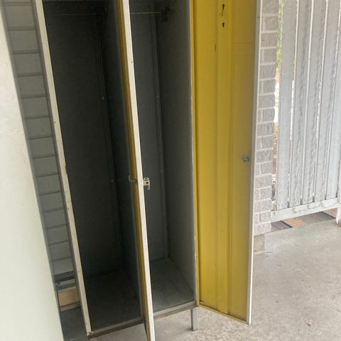 Vasemmalla puolen hyllyt oikealla tanko ja hylly