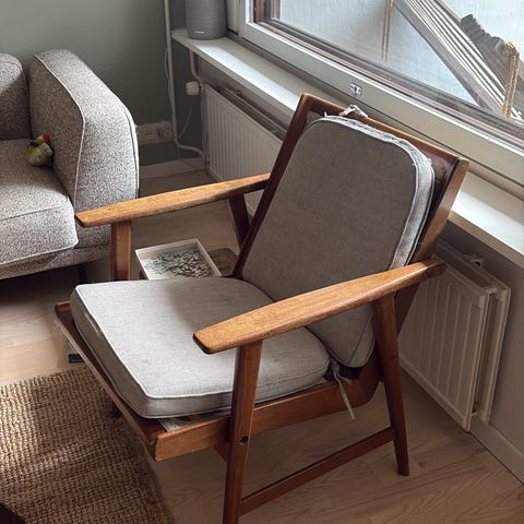 Kaksi kunnostettua, Asko Export, 70-luvun nojatuolia.