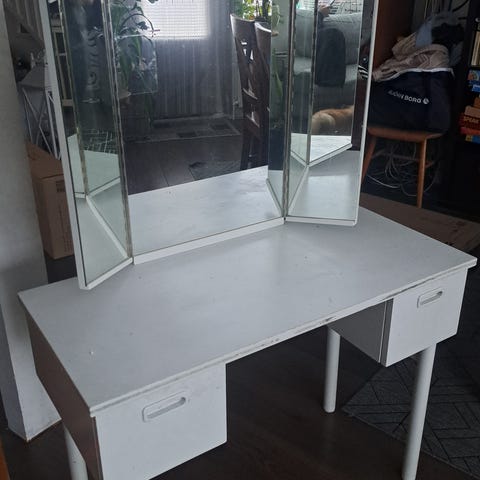 Vanha puinen peilipöytä + jakkara. Valkoiseksi maalattu. Maali lohkeillut muutamasta kohdasta. Peilin saa irrotettua tasosta. Peilissä pieni naarmu alaosassa (kuvassa). Pöytätason korkeus 65 cm. Vain nouto.