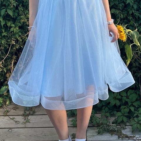 Takana nyöritys joka säätää kokoa välillä 32-34. Itse olen kokoa 34, mutta koko 32 istuu täydellisesti tässä mekossa minulle.