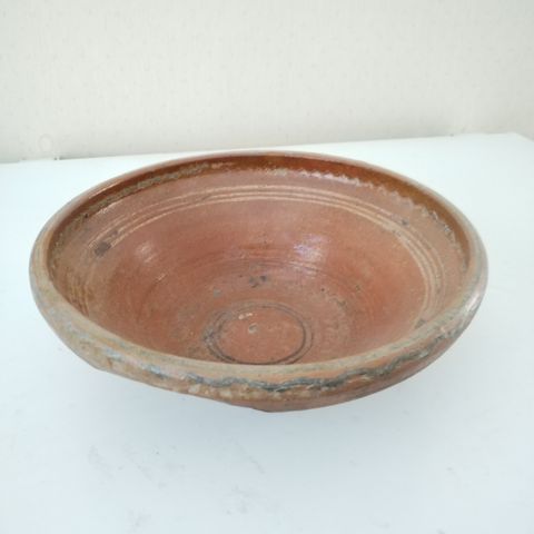 Vanha painava savivati,muutama lohkeama reunassa.Halkaisija 29cm,korkeus 5cm.