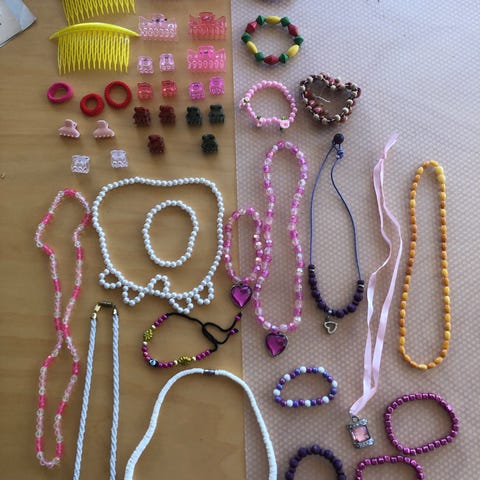 Erilaisia lasten hiuskoristeita, kuten panta- ja ponnarimallisia hiuskoristeita.