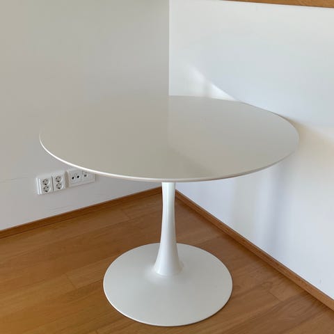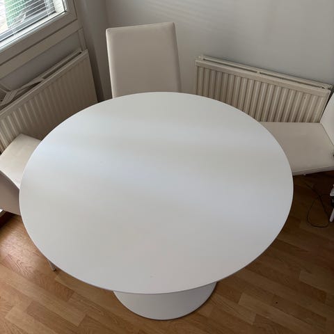 Valkoinen pyöreä pöytä 1 m halkaisija.