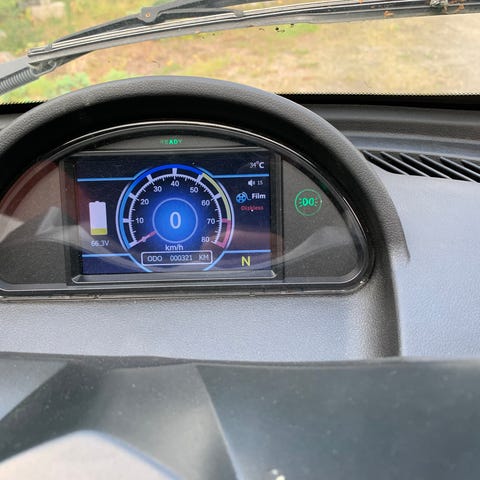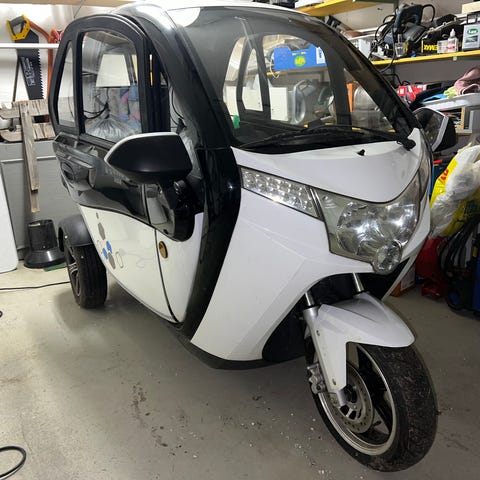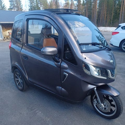 Neljällä pyörällä varustettu sähkömopo, jossa on punainen runko ja harmaa istuin. Mopossa on selkänojallinen istuin kääntyvillä käsinojilla, jalkataso sekä etukori pienten tavaroiden kuljettamiseen. Ohjausyksikkö sijaitsee etuhaarukassa ja siinä on hallintalaitteet kuljettajalle. Ajoneuvo soveltuu liikkumisen apuvälineeksi aikuiselle käyttäjälle tasaisilla alustoilla, kuten piha-alueilla ja jalkakäytävillä. Rakenne mahdollistaa istuma-asennossa ajamisen ja tukee käyttäjää selkänojan ja käsinojien avulla.
